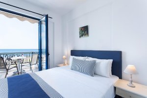 Select the Superior Studio with Panoramic View. The fully equipped kitchenette and the private balcony that offers simultaneous views of the garden, the mountains, and the Myrtoan Sea make it the strategic choice for those seeking total autonomy with the best vantage point in the area.